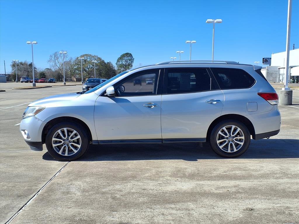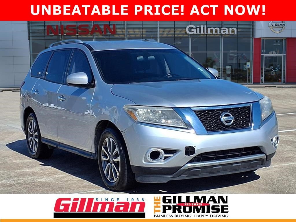Gillman's Lifetime Engine Warranty lasts as long as you own your vehicle - free with the Gillman Pre-Owned Promise. If the vehicle isn't right for you, return it in purchase condition within 2 days or 200 miles as part of our Happy-Driving Guarantee. Discover the versatility and comfort of a Silver 2014 Nissan Pathfinder SV 4dr SUV, perfect for family adventures or everyday commuting. Powered by a reliable 3.5L V6 engine paired with a smooth CVT and FWD, this Pathfinder delivers a confident drive. Enjoy spacious seating for up to seven with a flat-folding third row, sliding rear seat, and ample cargo space with multiple storage options. Stay connected and entertained with a 7-inch infotainment screen, Bluetooth audio, USB and iPod integration, and SiriusXM Satellite Radio. Convenience features include a power-adjustable driver seat, push-button start, rearview camera, rear parking sensors, and proximity entry. Safety is a priority with rear and front crumple zones, multiple airbags including third-row side curtain, stability and traction control, and a tire pressure monitoring system. Experience extra comfort with automatic climate control, rear air conditioning, aluminum alloy wheels, and a roof rack for added utility. Don't miss out on this well-equipped, reliable SUV - visit us for a test drive today! All vehicles subject to prior sale. We are not responsible for typographical errors and may change information without notice. Photos may not depict the actual vehicle. Tax, title, and license fees not included. Dealer Discount available to all buyers.Vehicles purchased from Gillman Automotive Group include a Bring It Back Guarantee: return the vehicle in purchase condition within two days or 200 miles. New current-model-year vehicles and qualifying pre-owned vehicles (under 90,000 miles and less than 7 years old) are eligible. Guarantee is non-transferable and has no cash value. Lifetime Warranty available on select pre-owned vehicles. See dealer for details; restrictions may apply.